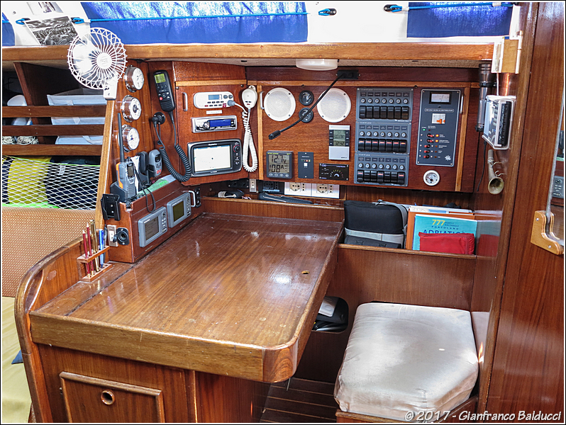 La zona carteggio, i quadri elettrici 12V e 220V, il monitor batterie, il display radar/chartplotter, 2 radio VHF fisse, radio VHF palmare, ricevitore GPS di riserva, ricevitore Navtex, autoradio, spazi di stivaggio per carte nautiche e pilot books.